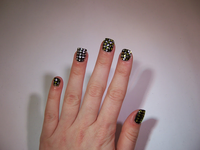 Grävde lite i lådan med nailartprylar och hittade de här som jag aldrig testat förut. Det är små fyrkantiga paljetter som sätts fast på naglarna med överlack bara. Pilligt som sjutton och halvvägs igenom ena handen fick jag ont i nacken. Det blev bara en hand... Note to self: nöj dig med en accentnagel nästa gång!